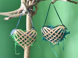 Spend the morning crafting these lovely hanging hearts, sure to brighten your holiday decor or perfect for gift giving. The hearts are woven from hardwood maple splint and are hung from hand-dyed silk ribbon in various colors. Students will weave two large and two smaller hearts. These hearts can be filled with small items. Additional kits will be available for sale.